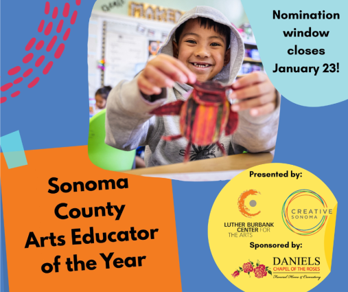 Time is running out to nominate YOUR favorite arts education teacher for the Sonoma County Arts Educator of the Year Award! This award, presented by Luther Burbank Center for the Arts and Creative Sonoma, recognizes individuals who have made significant contributions to the advancement of arts education over an extended period of time. The award seeks to honor professional arts educators working with the K-12 population, including, but not limited to, teaching artists and classroom teachers who teach visual art, music, drama, dance, or multimedia arts.